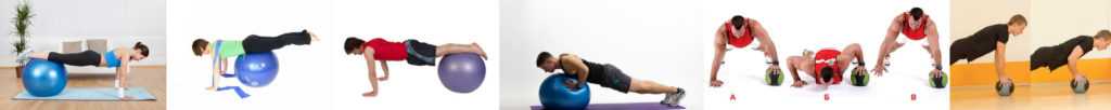 Отжимание на мяче. Поместите руки или ноги на мяч для упражнений. Оба варианта будут заставлять удерживать равновесие и напрягать пресс. Возможны варианты с фитболом и медболом.