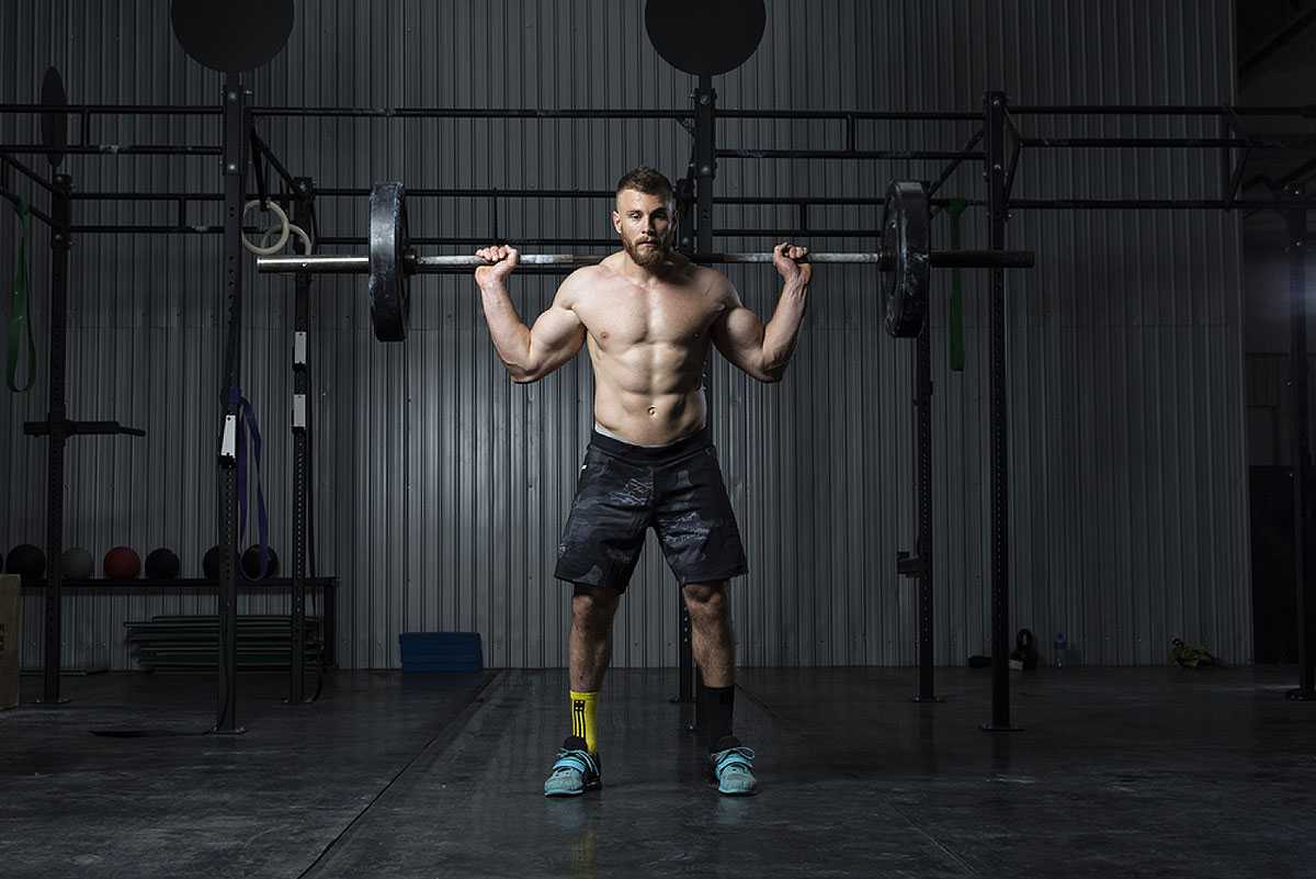 - Жим штанги стоя — 3 подхода, 4-6 повторов.