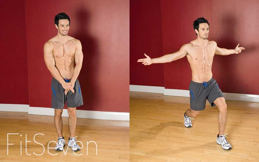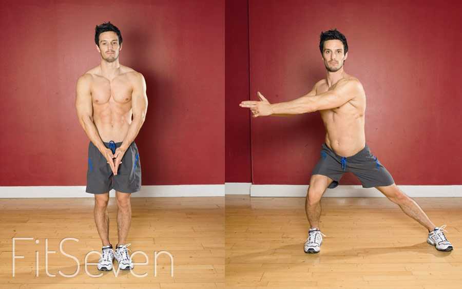 Исходное положение: ладони вместе, указательный и средний палец направлены вниз, остальные пальцы собраны внутрь ладони. Глубоко вдохнув, сделайте широкий шаг влево, отведя при этом прямые руки так же влево; правая нога остается прямой. Вернитесь в исходное положение на выдохе. Повторите, поменяв ногу и стараясь приседать как можно глубже. Выполните 3 подхода по 12-15 повторов.