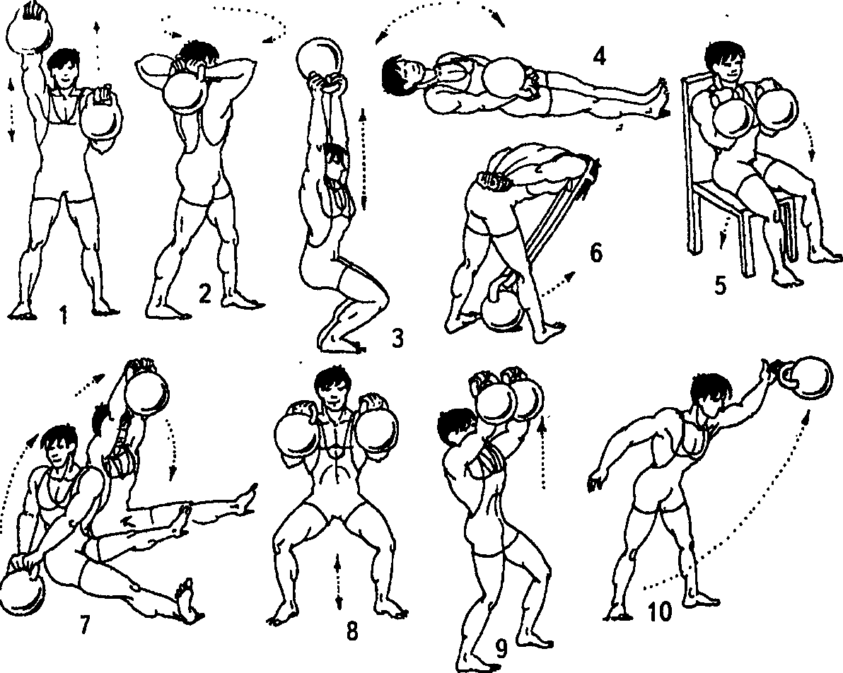 Силовые упражнения с отягощениями на грудные и плечевые мышцы следует выполнять, применяя снаряды весом вполовину веса тренирующегося плюс 5 килограммов, для ног — 75% веса тела плюс 5 килограммов.
