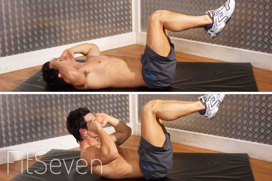 Ложитесь на коврик, ноги сгибайте в коленках, руки за голову. После занятия исходной позиции начинайте поднимать верхний торс на 25-30 сантиметров и задерживайтесь в верхней позиции на 2-3 секунды. Если есть желание сформировать более четкий рельеф, то можно использовать мяч (достаточно зажать его ногами).