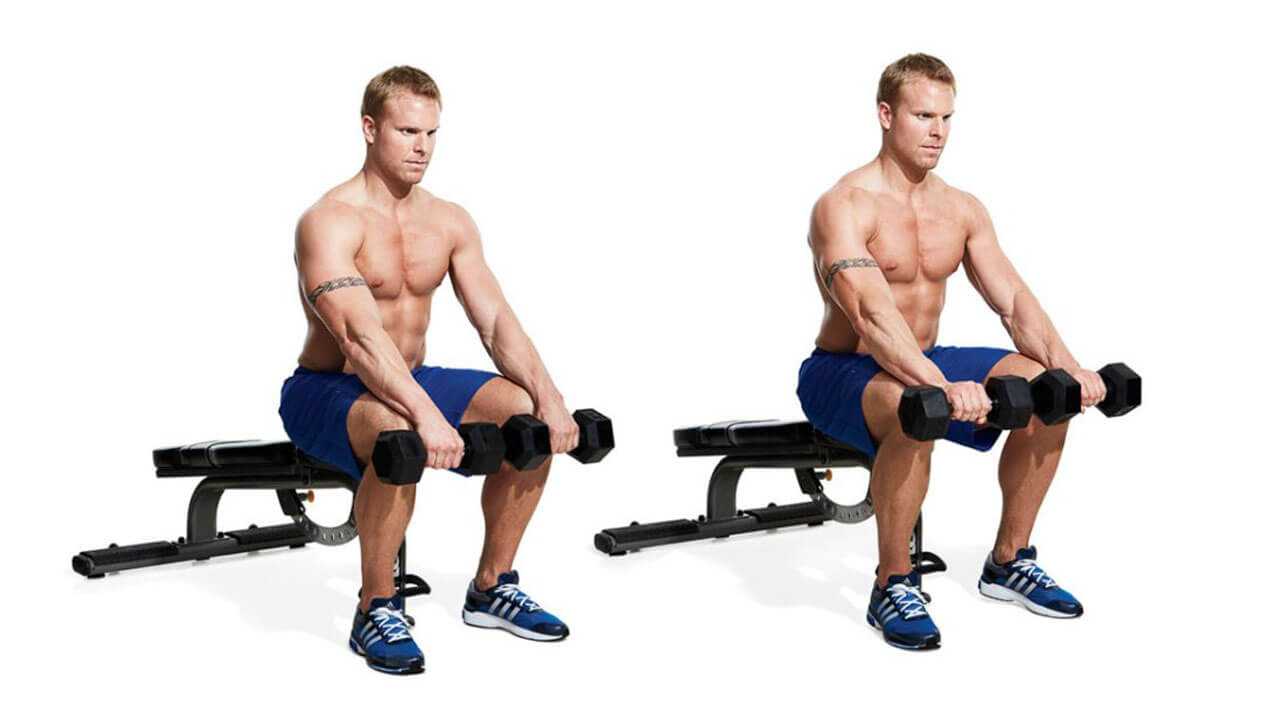 - Садитесь на скамью или стул, ноги согнуты под прямым углом. Предплечья лежат на коленях так, чтобы кисть находилась на весу. Вес удерживается обратным хватом (ладони направлены к полу).
