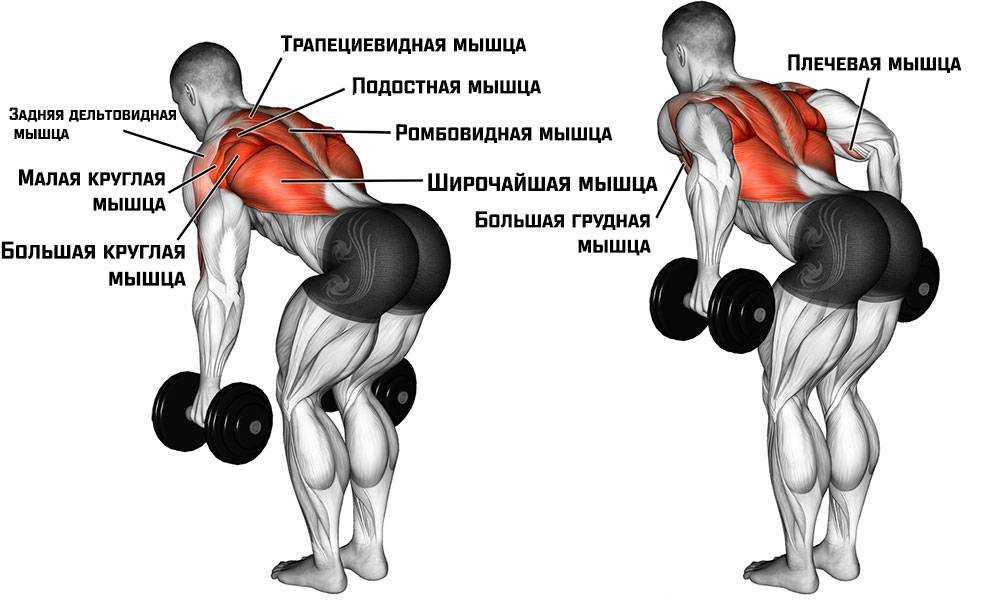 Тяга гантелей в наклоне – упражнение для интенсивной прокачки широчайших, тотально задействующее мускулатуру всей верхней части корпуса.