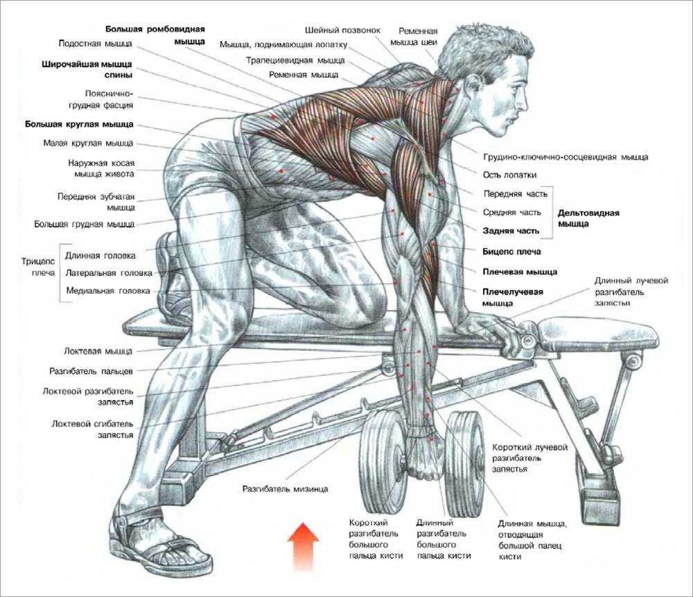 Частично приходится работать «трапециям» и ромбовидной мышце.