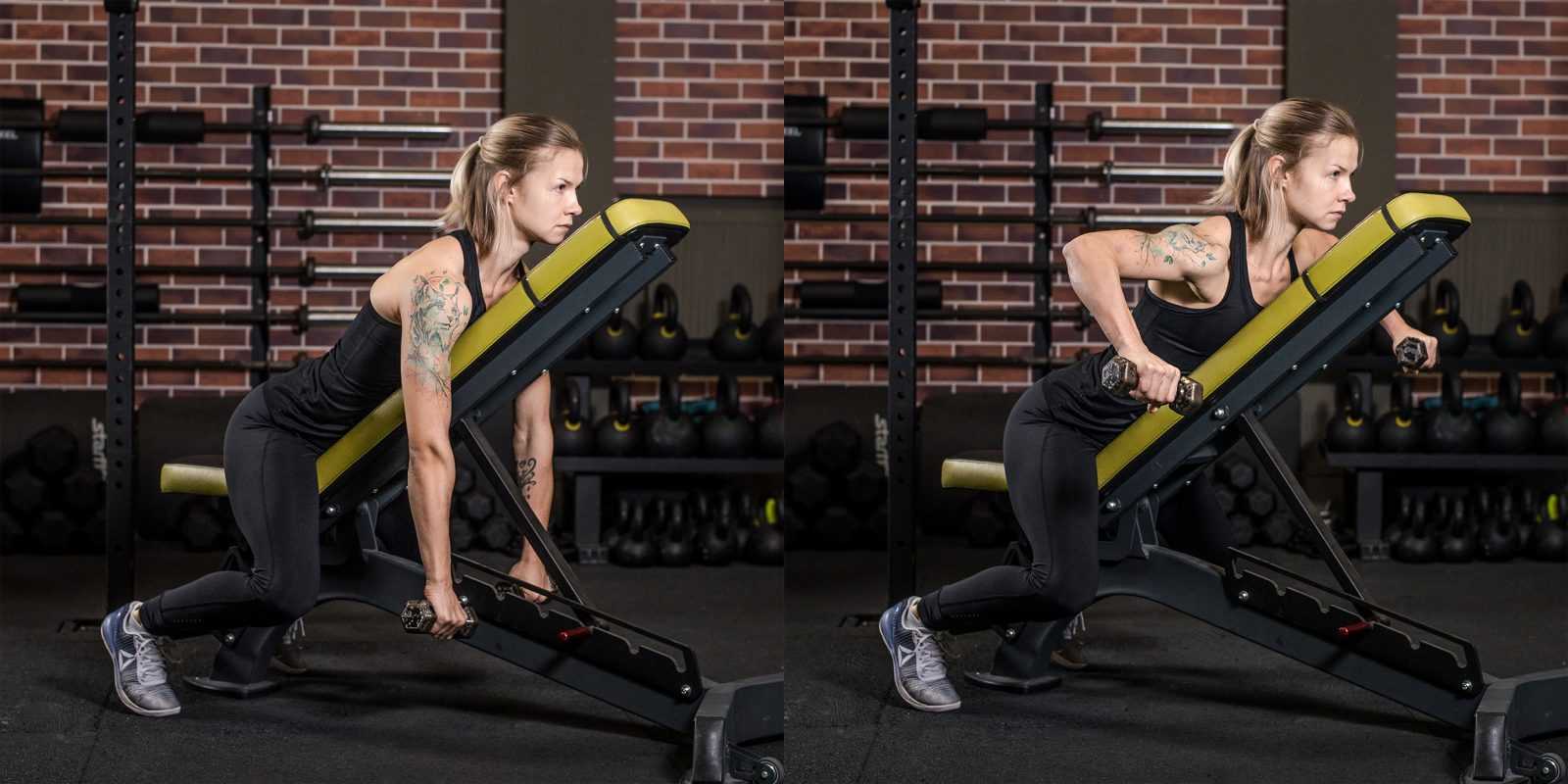Наклоняя корпус вниз под углом 90 градусов, вы нагружаете нижнюю часть широчайших. Работать должны именно мышцы спины, но трапециевидные мышцы, руки и плечи (задние дельты, трицепс, бицепс) тоже окажутся задействованы. Если скамья наклонена и туловище находится под углом 30-45 градусов, то уменьшается нагрузка на поясницу, прорабатывается верхняя область широчайших.