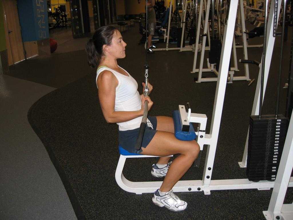 Итак, для начала нужно сесть на скамью и взять в руки рукоятки. Затем стоит подтянуть их к себе до тех пор, пока спина не примет вертикальное положение, с сохранением ее естественного изгиба в районе лопаток. При этом руки должны быть ровными. Это и есть исходное положение.
