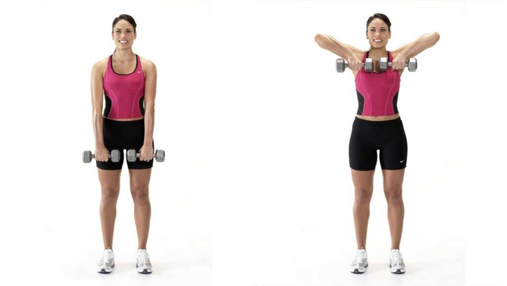 Встаньте прямо, держа перед собой штангу, гантели или рукоять тросового тренажера прямым хватом. Поднимите руки, одновременно сгибая их в локтях; держите ладони как можно ближе к телу. Вы можете поднять отягощение к подбородку, но многие женщины предпочитают поднимать его только до уровня груди.