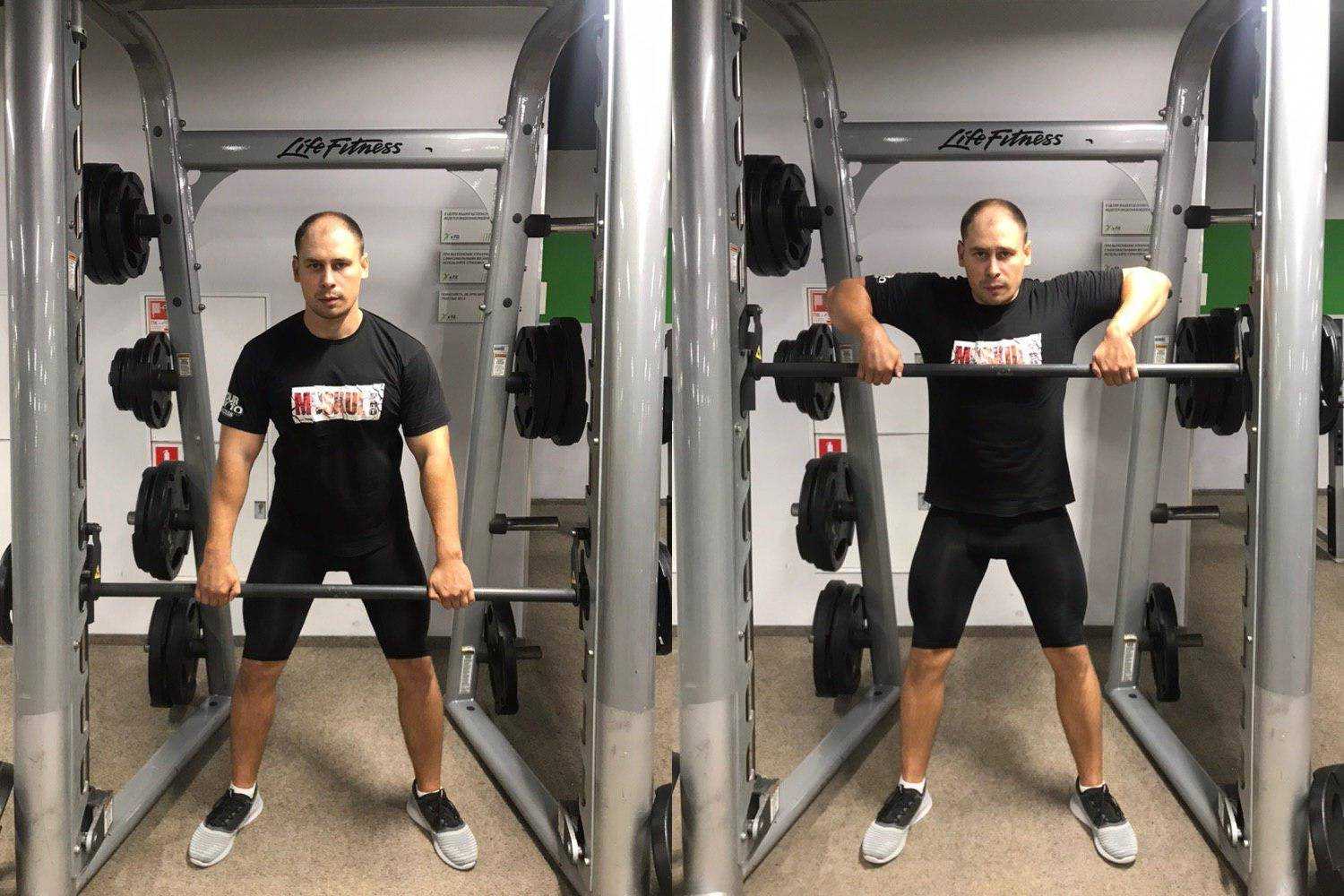 - Подойди к снаряду и возьмись за гриф верхним хватом чуть уже ширины плеч. Займи стартовую позицию на некотором удалении от рамы: встань в широкую стойку, слегка согни ноги в коленях, распрями корпус и статически напряги мышцы кора.