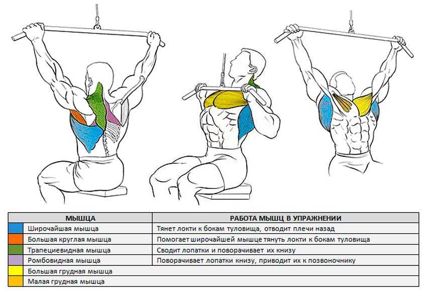 Помимо собственно широчайших мышц в «тяговую» работу вовлечены круглые и ромбовидные мышцы спины, дельтовидные, грудные мышцы и бицепсы (степень участия последних – целиком контролируемый параметр).