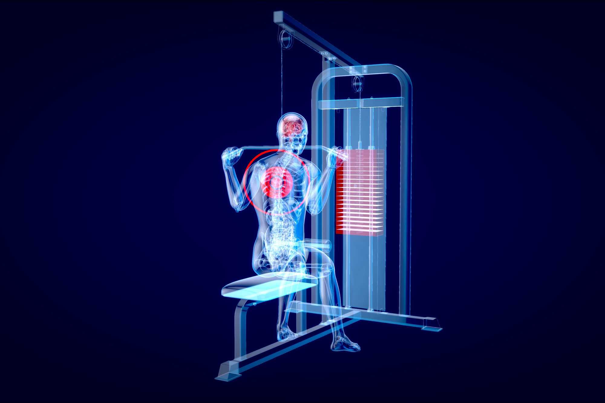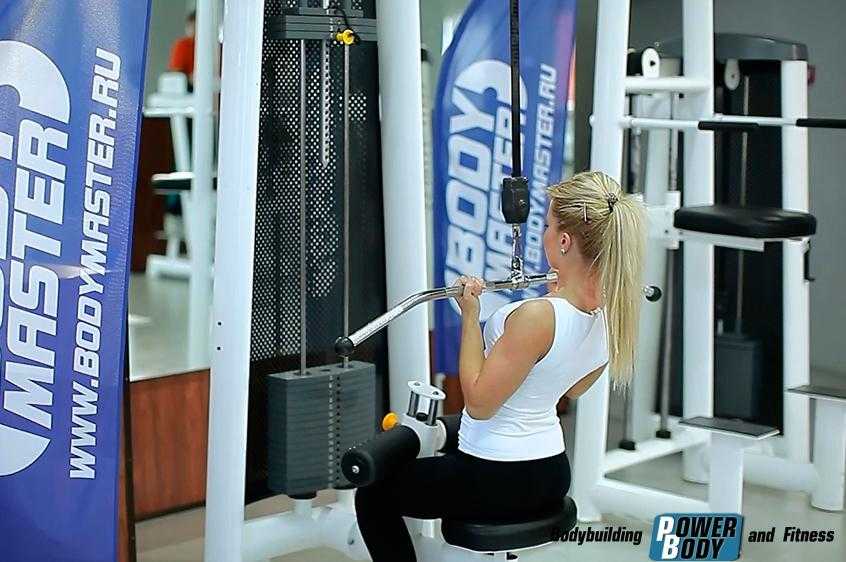 Тяга к груди на вертикальном блоке считается базовым упражнением, так как задействуются и плечевой, и локтевой сустав