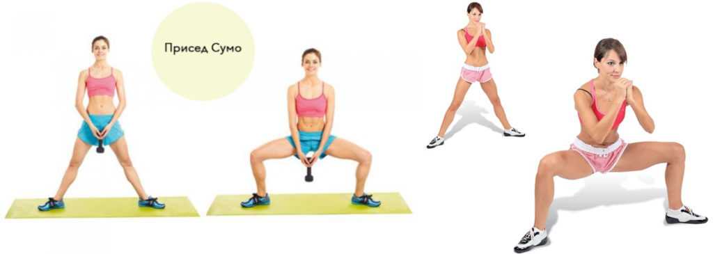 Приседать необходимо с широко расставленными ногами и удержанием в руках гантели. Носки разворачиваются в стороны на 45 C0. Приседание выполняется плавно, с медленным опусканием и поднятием попы. Преимуществом этого упражнения считается не только эффективная проработка ягодичных мышц, но и внутренние поверхности бедра. Мышцы в этой зоне у девушек от природы обычно слабы. Необходимо следить за ровностью спины и отсутствием выступа коленей за линию носков.