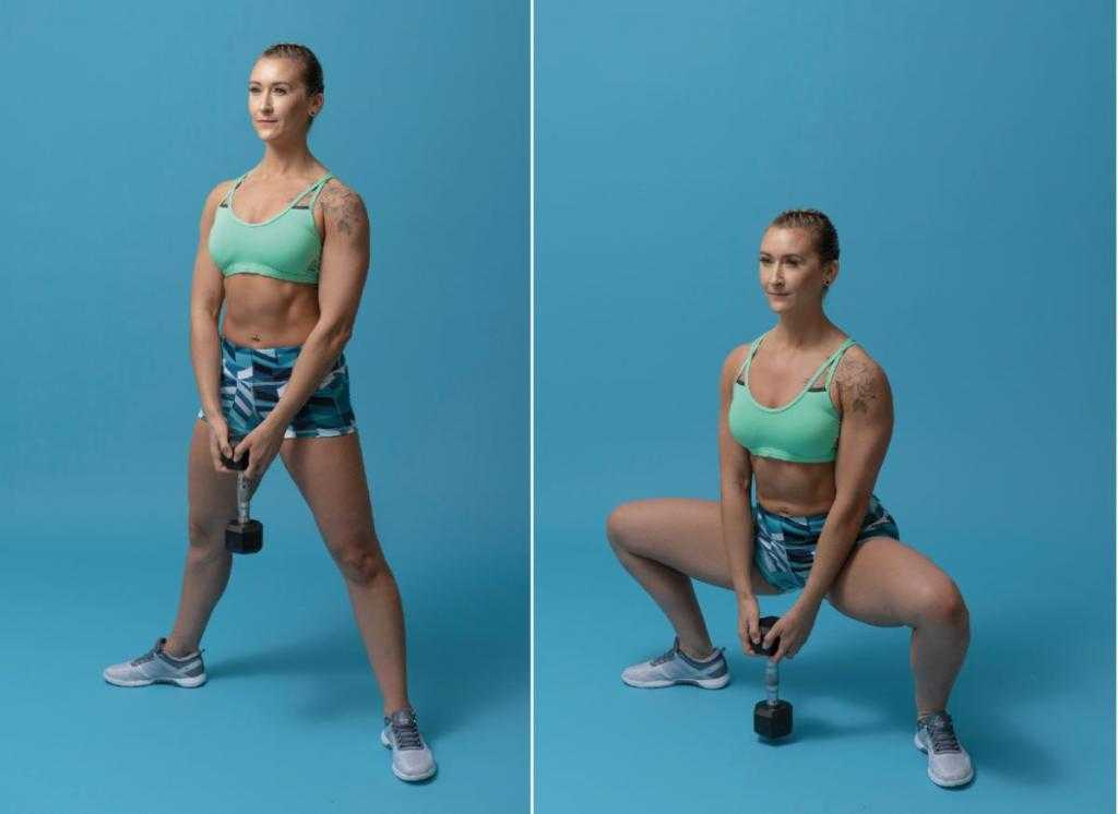 Похоже на исходную позицию борцов известного японского вида спорта. Для выполнения упражнения необходимо расставить ноги как можно шире, держа гантель перед собой обеими руками. Затем медленно делайте глубокое приседание, зафиксируйте положение и возвращайтесь к верхней точке.