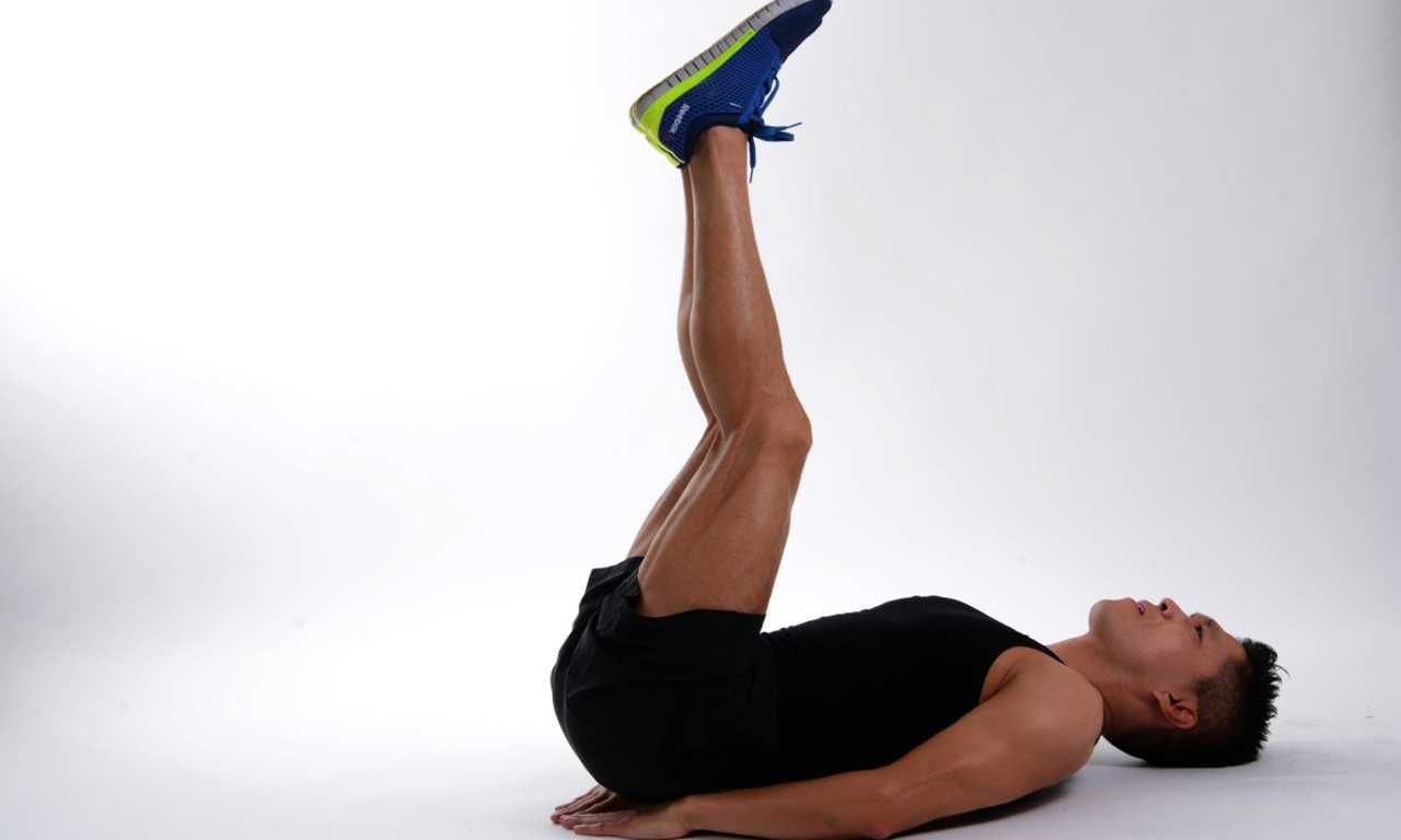 Обратные скручивания. Вытяните руки вдоль корпуса и поднимите ноги так, чтобы икры были параллельны полу. Оторвите таз, поднимите его с пола и подтяните колени к груди.