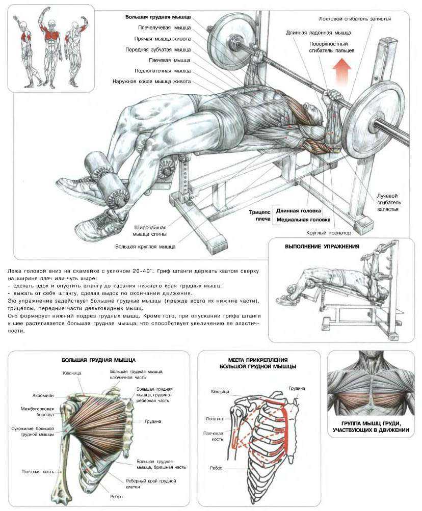 Эта тренировка дважды задействует наклонные жимы. Однако меняется способ. Например, угол наклона скамьи для штанги намного круче, чем при использовании гантелей. Поэтому верх грудных мышц будет прорабатываться по-разному. Во-вторых, Вы будете работать с различной интенсивностью и диапазоном подходов под каждым углом. Мы не отказываемся от других углов: в этой программе есть жим головой вниз. После окончания многосуставных упражнений, Вы перескакиваете на односуставные, которые фокусируются на верхней части грудных мышц.