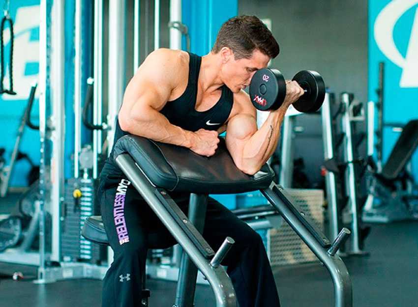 Проработка бицепса гантелями в скамье Скотта