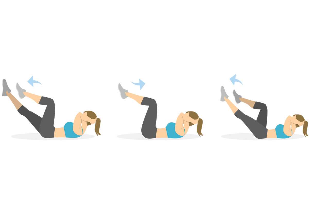 Лягте на пол, руки в замке на затылке, локти расставлены в стороны, согните ноги в коленях так, чтобы голени были параллельны полу. Вытяните левую ногу и соедините левый локоть с коленом правой ноги. Затем выпрямите правую ногу и соедините правый локоть с левым коленом. Повторите.