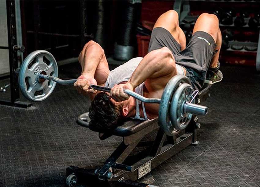 Выполняется лежа с использованием W-образного грифа. Прямой гриф тоже можно использовать, однако у некоторых спортсменов могут болеть запястья. Если упражнение выполняется в зале, то для удобства лучшим вариантом будет использовать скамью для французского жима, а если такого нет – скамью Скотта.