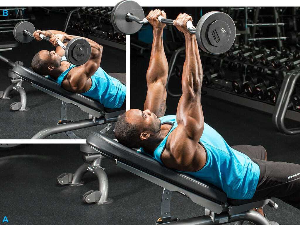 Базовое и тяжелое упражнение позволяет работать с большим весом. Помимо трицепсов в работу включаются грудные и дельтовидные мышцы. Руки на грифе нужно расположить так, чтобы они во время выполнения жима двигались как можно ближе к торсу. Выполняется жим на выдохе. Данное упражнение лучше всего выполнять в начале тренировки трицепсов. Если тренировка направлена на развитие еще и грудных мышц, то жим штанги узким хватом выполняется первым, после всех упражнений, направленных на развитие грудных мышц. Из всего арсенала упражнений для трицепсов это упражнение лучше выполнять с большим весом.