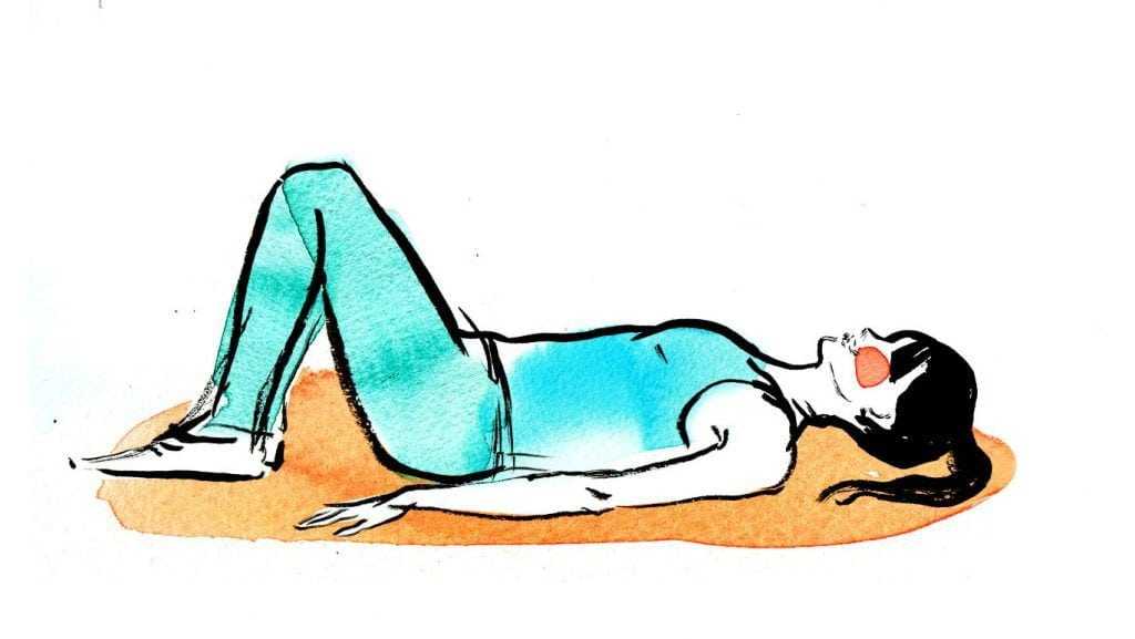 - «Скручивания» (3-4 подхода по 10 повторов) — классическое упражнение для брюшного пресса. Выполняется лежа на спине. Руки находятся под шеей. Ноги согнуты в коленях, ступни прижаты к стене. На выдохе спина сгибается так, чтобы плечи оторвались от пола. При этом поясница должна сильнее прижаться к полу. На вдохе необходимо вернуться в исходное положение.