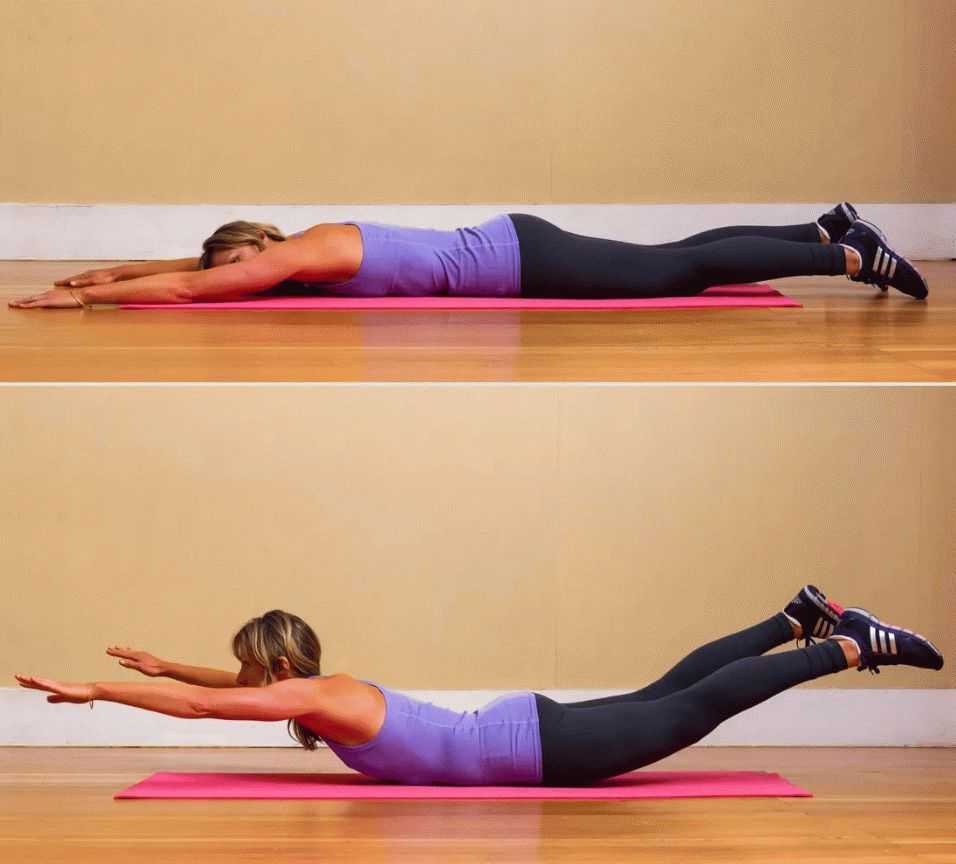 Это упражнение – разновидность обычной гиперэкстензии. Ложимся на живот. Руки и ноги разводим немного в сторону и начинаем одновременно их поднимать. Ноги прямые, руки вытянуты и немного согнуты в локтях. Лопатки сводим вместе, грудь распрямляем. Старайтесь поднимать корпус невысоко, голова смотрит в пол, выдох на подъеме. Надо выполнить 3 подхода пораз каждый.