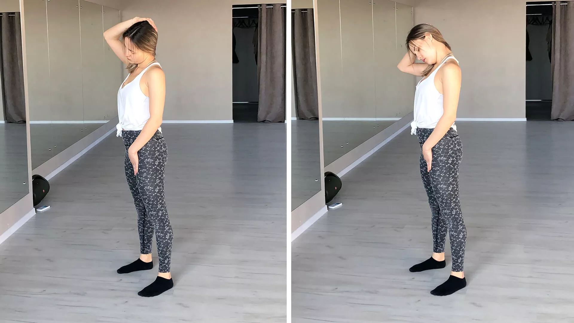 Тянитесь ухом к плечу в каждую сторону попеременно, вытягивая боковые стороны шеи.