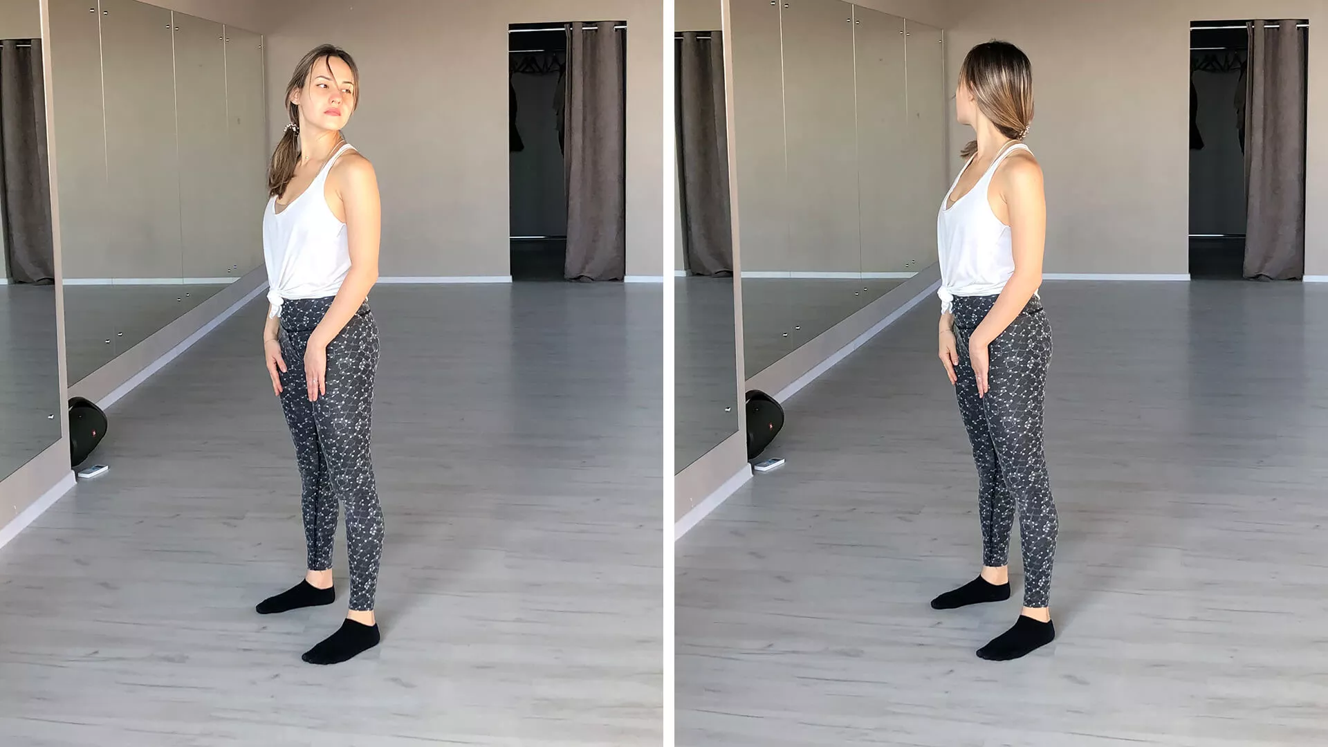 Поставив ноги вместе, держите позвоночник ровно, встаньте на носочки и удерживайтесь в таком положении до 5 секунд.